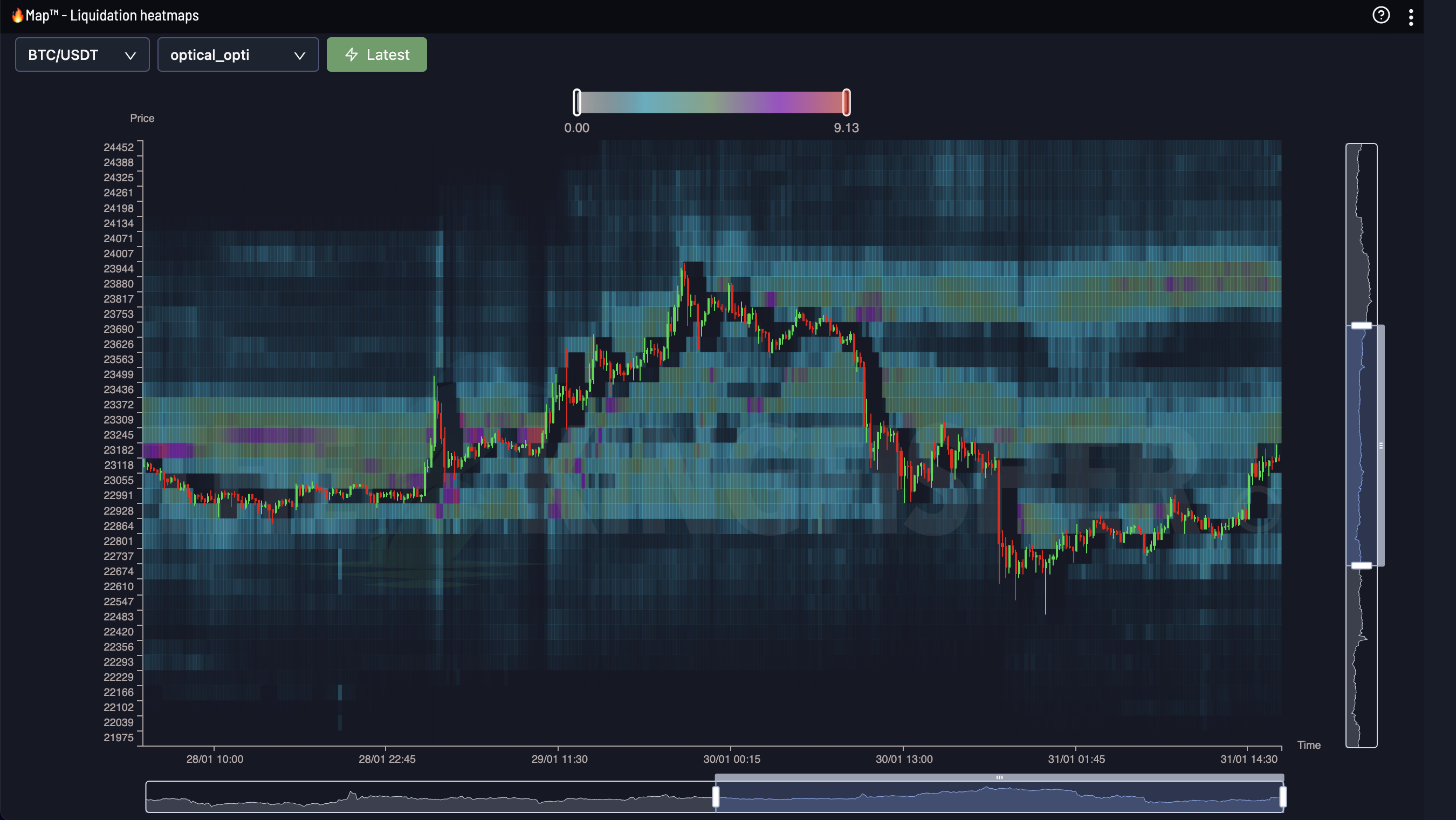 **The Optical\_opti** view provides a short-term < 72h timeframe aggregation of clusters. They are designed for scalpers and get a quick view of the high and medium-leverage liquidation prices<br>